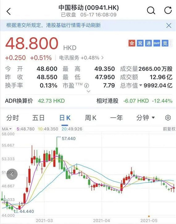 截至17日收盤,中國移動在港股的市值有近一萬億!