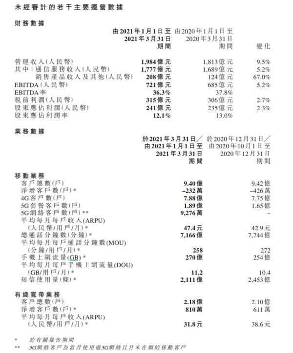 財務(wù)數(shù)據(jù)顯示,一季度,中國移動營運(yùn)收入為1984億元,比上年同期增長9.5%。其中,通信服務(wù)收入為1777億元,比上年同期上升5.2%。股東應(yīng)占利潤為241億元,比上年同期上升2.3%。