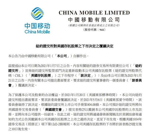 5月7日晚間,三大運(yùn)營商紛紛公告,紐約證交所委員會維持了紐約證交所監(jiān)管部門重新啟動本公司美國存托證券ADR下市程序的決定,預(yù)計紐約證交所將向美國證券交易委員會提交25表格以撤銷本公司美國存托證券的上市及注冊(退市)。