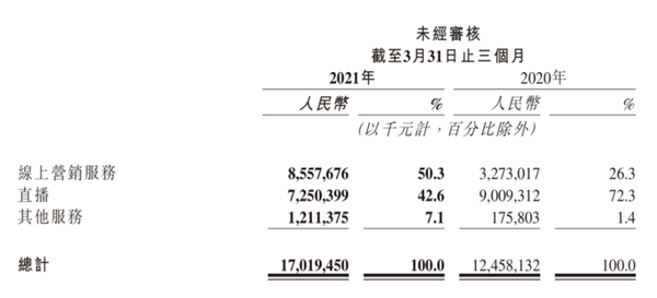 2021年第一季度在線營(yíng)銷服務(wù)的收入同比增長(zhǎng)161.5%至人民幣86億元,同時(shí),繼上一季度廣告收入超過(guò)直播收入后,這一季度,廣告對(duì)總收入的貢獻(xiàn)首次超過(guò)50%。