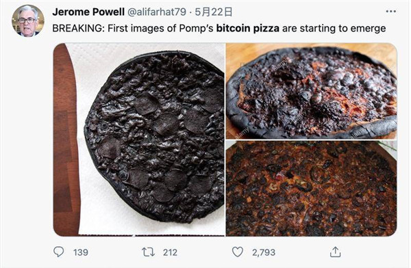 諷刺賬號(hào)“鮑威爾”在比特幣披薩節(jié)當(dāng)天的諷刺推文:幣圈大佬Pomp做的比薩長(zhǎng)這樣