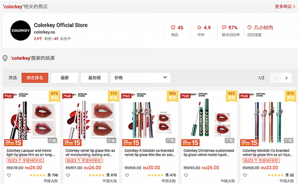 除了官網(wǎng)銷售,品牌們也會借助其它渠道平臺。目前,包括完美日記、花西子均借助了天貓出海。另一個彩妝品牌珂拉琪colorkey,則入駐了東南亞最大的電商平臺Shopee。
