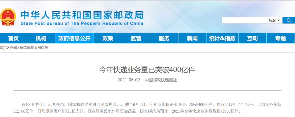 央廣網(wǎng)北京6月2日消息(記者 萬(wàn)玉航)據(jù)國(guó)家郵政局消息,截至6月1日,今年我國(guó)快遞業(yè)務(wù)量已突破400億件,接近2017年全年水平。數(shù)據(jù)顯示,今年以來(lái)日均快遞業(yè)務(wù)量超過(guò)2.66億件,日均服務(wù)用戶超過(guò)5億人次,行業(yè)服務(wù)民生作用更加凸顯。國(guó)家郵政局預(yù)計(jì),2021年全年快遞業(yè)務(wù)量將超過(guò)950億件。