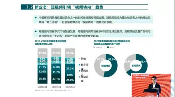 其中顯示,中國移動網(wǎng)民每日超過四分之一的時間在使用短視頻應(yīng)用,短視頻已成為圖文和語音之外的移動互聯(lián)網(wǎng)“第三語言”,社會信息媒介的“視頻轉(zhuǎn)向”趨勢仍在發(fā)展。
