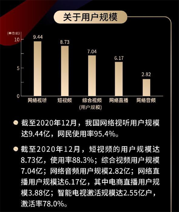 而在第九屆中國網(wǎng)絡(luò)視聽大會發(fā)布的《2021中國網(wǎng)絡(luò)視聽發(fā)展研究報告》則給出了具體用戶規(guī)模:截至2020年12月,短視頻用戶規(guī)模達(dá)8.73億,使用率88.3%。