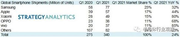 根據(jù)Counterpoint 數(shù)據(jù)顯示,今年2月份,小米集團手機全球市場份額達到13%,成為中國第一大手機廠商。而根據(jù)Strategy Analytics發(fā)布的2021年Q1全球智能手機市場報告,排名第三的小米出貨量4900萬臺,同比增長了80%,這個份額領先于排名前五的所有手機廠商。