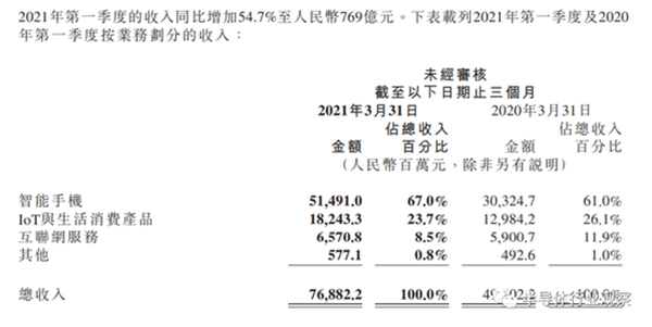 據(jù)財報顯示,小米集團第一季度營收768.8億元人民幣,同比增長54.7%。其中智能手機業(yè)務第一季度智能手機收入514.9億元人民幣,同比增長69.8%,全球智能手機出貨量同比增長69.1,達到49.4百萬臺。小米境外市場收入達到人民幣374億元,同比增長50.6%。