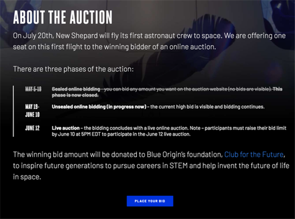 如果碰巧你也是富豪,可以登錄藍(lán)色起源競拍這個(gè)座位。當(dāng)然,普通人也可以去隨時(shí)圍觀下這場拍賣——目前,一個(gè)座位已經(jīng)被叫上了350萬美金的高價(jià),不過這個(gè)能去外太空的價(jià)格還不如孫宇晨當(dāng)年拍賣和巴菲特吃一頓飯貴。目前350萬美金還不是最終價(jià)格,最終入圍的富豪們將要在6月12日,也就是下周參與一場線上公開拍賣,最終爭搶一個(gè)座位。