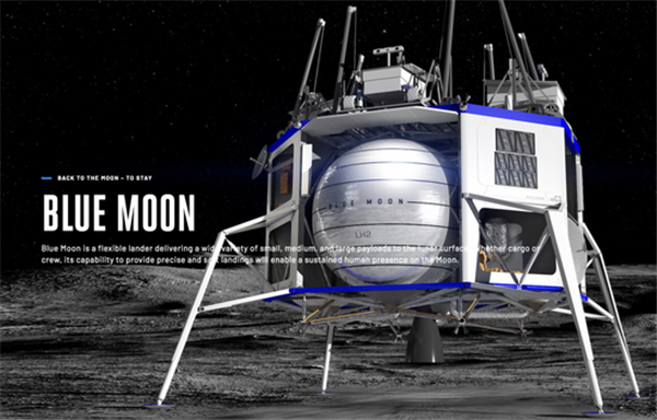 值得注意的是,除了上面提到的載人外太空飛行計(jì)劃,藍(lán)色起源還有一個(gè)重要的長遠(yuǎn)計(jì)劃——一個(gè)名為藍(lán)月的登月計(jì)劃。 這個(gè)計(jì)劃最早在2018年被提及,并在2019年正式由貝索斯對外宣布。 整個(gè)計(jì)劃的終極目標(biāo)是再次返回月球,并抵達(dá)月球南極。