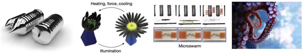 從結(jié)構(gòu)到功能和復(fù)雜性日益增加的智能物質(zhì)的概念轉(zhuǎn)換:合成后不能改變其性質(zhì),如純硅;光響應(yīng)記憶合成材料向日葵環(huán)境自適應(yīng)的打開和關(guān)閉;章魚的觸手,帶有嵌入式傳感器、執(zhí)行器和神經(jīng)系統(tǒng)(來源:Nature)