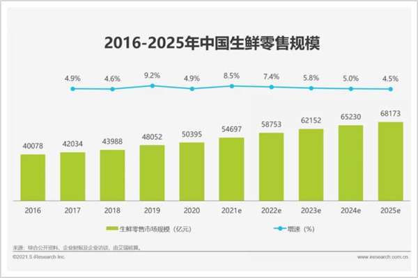 相關(guān)數(shù)據(jù)顯示,近年來(lái),中國(guó)生鮮零售市場(chǎng)保持穩(wěn)步增長(zhǎng),2020年中國(guó)生鮮零售市場(chǎng)規(guī)模超5萬(wàn)億元。艾瑞預(yù)計(jì),到2025年中國(guó)生鮮零售市場(chǎng)規(guī)模將達(dá)到6.8萬(wàn)億元。