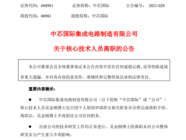 7月4日晚間,中芯國(guó)際公告稱,該公司核心技術(shù)人員吳金剛博士近日因個(gè)人原因申請(qǐng)辭去相關(guān)職務(wù)并辦理完成離職手續(xù)。離職后,吳金剛博士不再擔(dān)任公司任何職務(wù)。