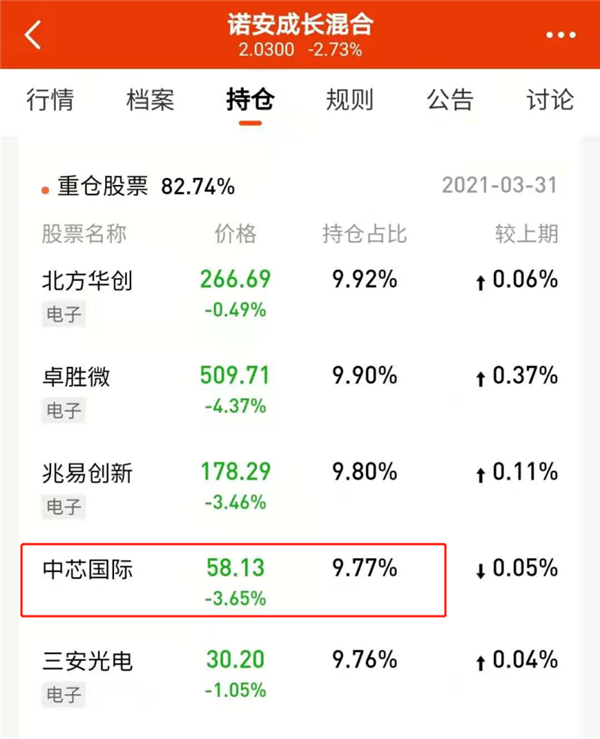 根據(jù)諾安成長(zhǎng)混合基金的最新持倉(cāng)顯示,中芯國(guó)際是其第四大重倉(cāng)股。