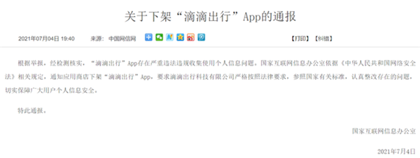 ↑關(guān)于下架“滴滴出行”App的通報(bào)截圖