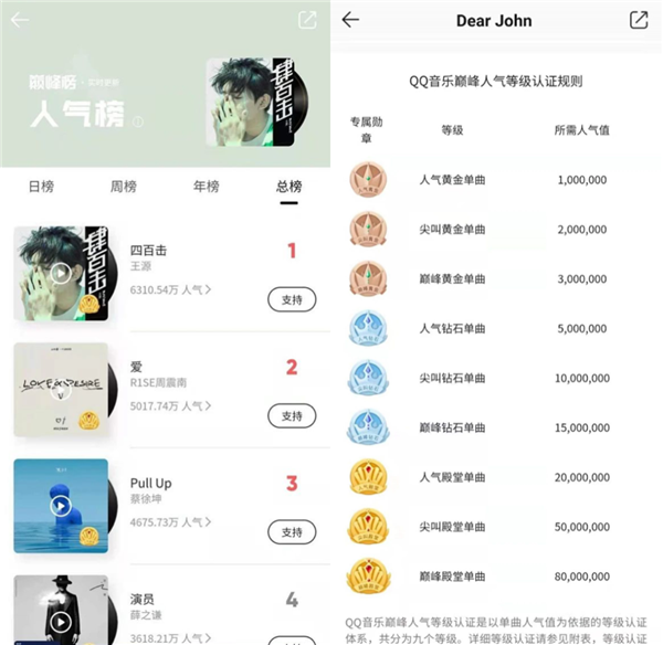 另一方面,打賞的樂幣數(shù)量直接等同于人氣值,反映到人氣排行榜,不同的人氣值還會讓單曲有不同的認(rèn)證,充分迎合了粉絲的心理。這或許也是為什么QQ音樂的打投榜單上排名靠前的都以偶像為主。