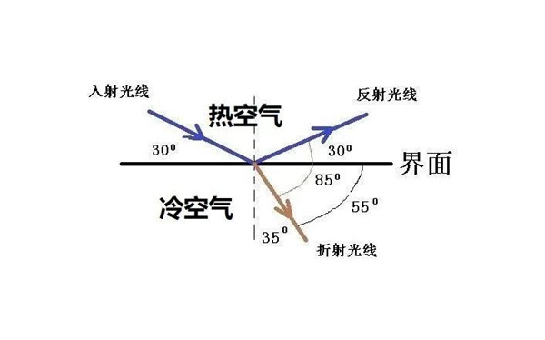 還有一種情況,光在同一種介質(zhì)中傳播,當(dāng)介質(zhì)密度不均勻時(shí),也會出現(xiàn)折射現(xiàn)象,其實(shí),這就是相當(dāng)于兩種密度不同的介質(zhì),光始終會向密度大的方向偏轉(zhuǎn)。