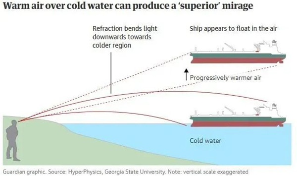 所以,這真的不是外星飛碟,也不是平行世界出現(xiàn)了,而是一種與光的折射有關(guān)的物理現(xiàn)象。