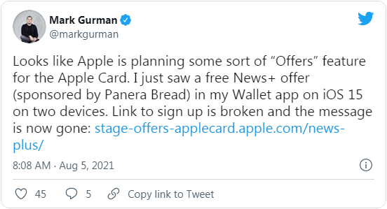 MacRumors 報(bào)道稱:蘋果已于本周開(kāi)始向 Apple Card 用戶推廣獨(dú)家優(yōu)惠,且在訪問(wèn)錢包應(yīng)用的時(shí)候,相關(guān)優(yōu)惠將直接呈現(xiàn)在用戶眼前。由彭博社 Mark Gurman 在 Twitter 上分享的消息可知,蘋果為 Apple Card 用戶提供了免費(fèi)訪問(wèn) Apple News+、以及在 Panera Bread 下單時(shí)的咖啡無(wú)限續(xù)杯福利。