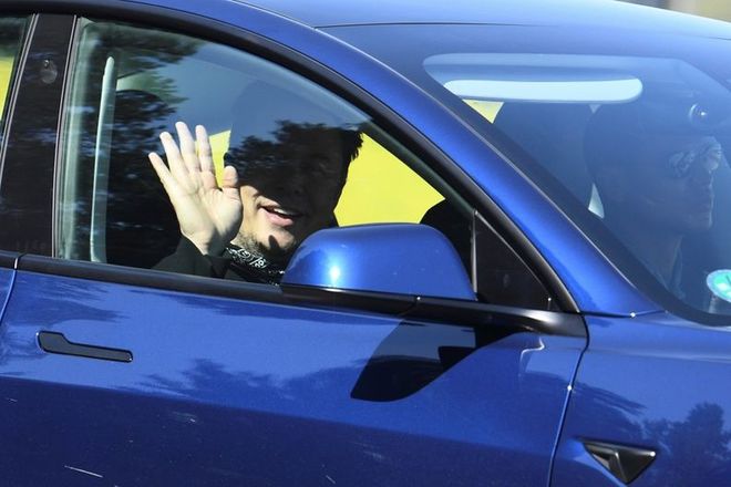 圖示:8 月 13 日,馬斯克乘車抵達(dá)柏林超級(jí)工廠建筑工地時(shí)向窗外揮手致意