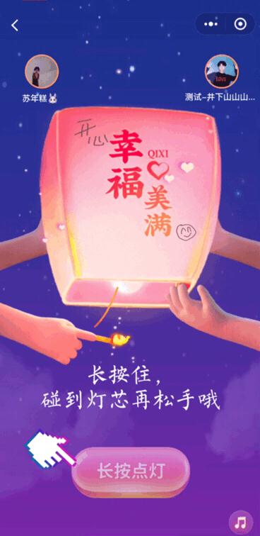 可以自己放飛,也可以邀請 ta 一起放飛,長按頁面按鈕,控制火柴點(diǎn)燃燈芯,孔明燈點(diǎn)亮后就可以等候放飛啦。