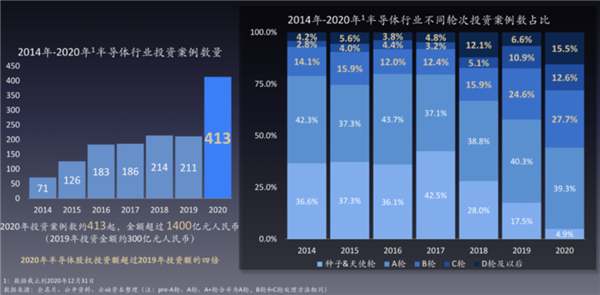 2020年半導(dǎo)體行業(yè)股權(quán)投資案例達413起,投資金額超過1400億元人民幣,與2019年300億投資額相比,增長近4倍。