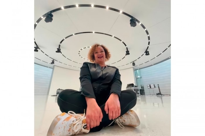杰克遜即興拍攝的場景是在蘋果發(fā)布會(huì)中經(jīng)常出現(xiàn)的場景,其中包括一個(gè)天花板上有同心圓的圓形房間。白色空間里有一些輪子上的箱子,它們通常被用來裝廣播或音樂會(huì)設(shè)備,旁邊還有燈光和其他設(shè)備。