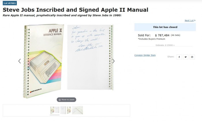 本屆 RR Auction 拍賣會(huì)上,除了罕見、尚能運(yùn)行的 Apple-1 電腦以約合 240 萬人民幣成拍之外,還有多款非常有價(jià)值的蘋果相關(guān)產(chǎn)品被拍賣。其中由史蒂夫·喬布斯(Steve Jobs)和邁克·馬庫拉(Mike Markkula)簽名的 Apple II 手冊(cè)共有 46 人出價(jià),最終成拍價(jià)格為 787484 美元(約合 5119827.23 元)。