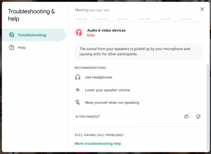 點(diǎn)擊文本通知后,用戶將被引導(dǎo)至 Google Meet 的幫助中心,以進(jìn)一步排查并消除導(dǎo)致回聲的故障點(diǎn)。