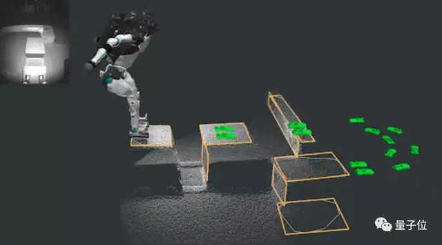 其中,Atlas會通過深度相機(jī)捕捉到紅外圖像(左上角),并從圖像數(shù)據(jù)中提取出點云,繪制出跑酷障礙物的表面(橙色輪廓)。