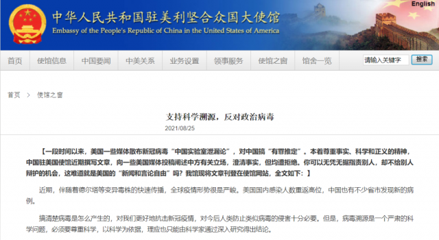 中國駐美國大使館24日在網(wǎng)站刊發(fā)《支持科學(xué)溯源,反對政治病毒》一文。該文的按語中指出,一段時間以來,美國一些媒體散布新冠病毒“中國實驗室泄漏論”,對中國搞“有罪推定”,使館近期撰寫文章,旨在向一些美國媒體投稿闡述中方有關(guān)立場,澄清事實,但均遭拒絕。你可以無憑無據(jù)指責(zé)別人,卻不給別人辯護(hù)的機(jī)會,這難道就是美國的“新聞和言論自由”嗎?