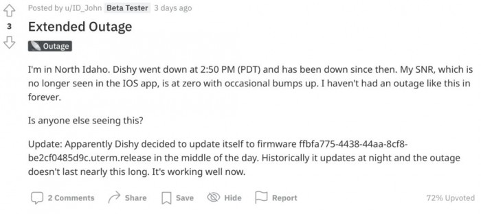 根據(jù) Reddit 用戶(hù) ID_John 的說(shuō)法,在他的服務(wù)中斷后,Starlink 的用戶(hù)終端,也被稱(chēng)為 Dishy,在中間進(jìn)行了一次意外的軟件更新,之后服務(wù)恢復(fù)了,Starlink 也正常運(yùn)行了。