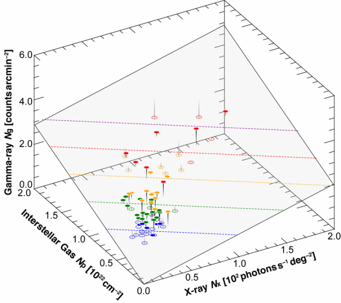 這項(xiàng)研究的原創(chuàng)性在于,伽馬射線輻射是由質(zhì)子和電子成分的線性組合來(lái)表示的。天文學(xué)家知道一個(gè)關(guān)系,即質(zhì)子的伽馬射線強(qiáng)度與通過(guò)無(wú)線電線成像觀測(cè)得到的星際氣體密度成正比。另一方面,來(lái)自電子的伽馬射線也被認(rèn)為與來(lái)自電子的X射線強(qiáng)度成正比。因此,他們把總的伽馬射線強(qiáng)度表示為兩個(gè)伽馬射線成分的總和,一個(gè)來(lái)自質(zhì)子源,另一個(gè)來(lái)自電子源。這導(dǎo)致了對(duì)三個(gè)獨(dú)立觀測(cè)點(diǎn)的統(tǒng)一理解(圖2)。