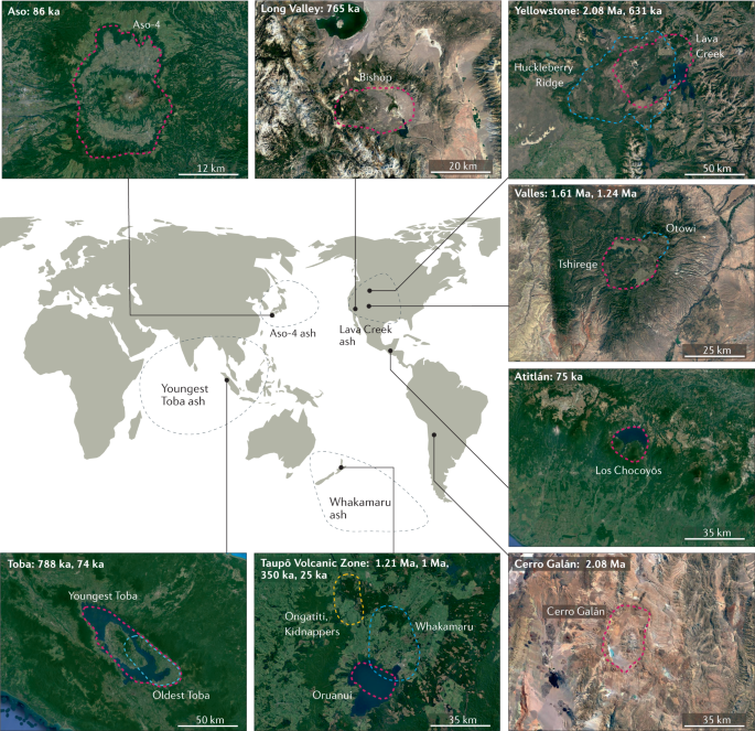 當(dāng)這些巨大的火山系統(tǒng)爆發(fā)時(shí),相關(guān)的 “超級(jí)爆發(fā)”代表了由自然災(zāi)害引起的最具災(zāi)難性的事件,導(dǎo)致廣泛的火山灰和火山碎屑流,其厚度可達(dá)數(shù)百米,覆蓋數(shù)千至數(shù)萬(wàn)平方公里。這些事件也會(huì)在地面上留下巨大的環(huán)形坑,稱為火山口,這是由于地球表面因清除如此大量的巖漿而塌陷。