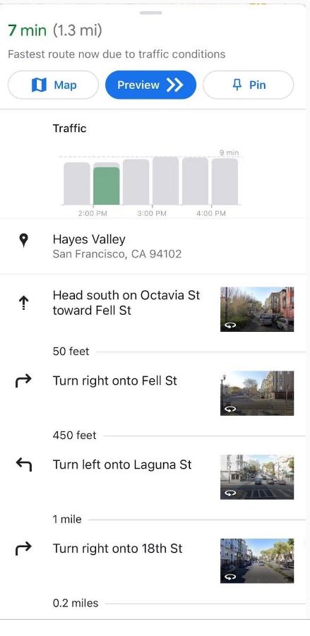但值得注意的是,如果你不同意按"開始"鍵,導(dǎo)航功能將被限制在極其簡陋的靜態(tài)的方向列表中,只在轉(zhuǎn)彎的每一步提供街景提示,這相當(dāng)于倒退 20 年使用 2001 年的地圖應(yīng)用程序。