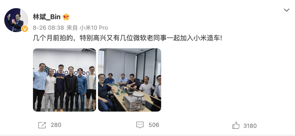 在收購深動科技后,小米聯(lián)合創(chuàng)始人、副董事長林斌隨后在微博上曬圖稱:“特別高興又有幾位微軟老同事一起加入小米造車! ”