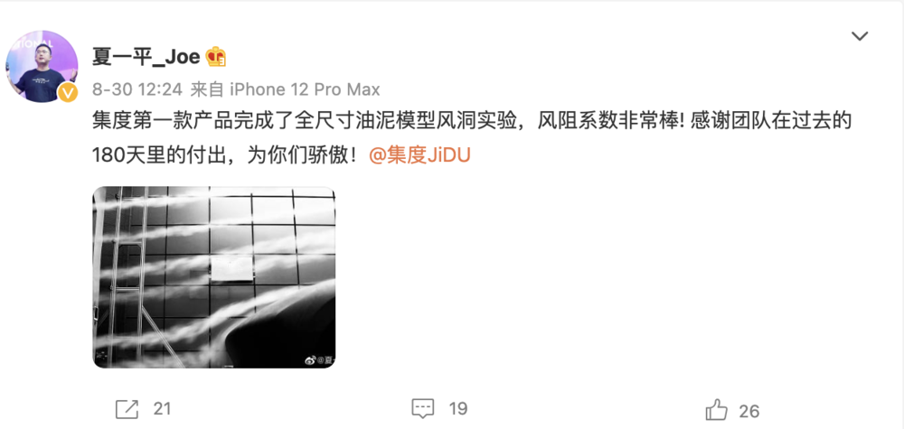 這里,我們不妨看看隔壁“百度汽車”的造車進(jìn)度。百度旗下造車品牌集度汽車 CEO 夏一平,在微博發(fā)布首款汽車產(chǎn)品風(fēng)洞圖,并稱:“集度第一款產(chǎn)品完成了全尺寸油泥模型風(fēng)洞實(shí)驗(yàn),風(fēng)阻系數(shù)非常棒!感謝團(tuán)隊(duì)在過去 180 天的付出,為你們驕傲!”。
