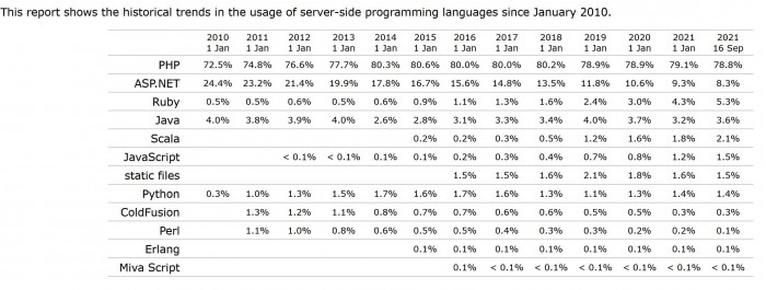 根據(jù)調查,PHP 在 2010 年的市場份額為 72.5%,而在 2021 年占比達到 78.9%。只有一個其他的服務器端語言曾經突破 10% 的份額--這個競爭對手是 ASP.NET,它在 2010 年擁有令人印象深刻的 24.4% 的份額,但在 1 月份下降到 9.3%,這個月下降到 8.3%。