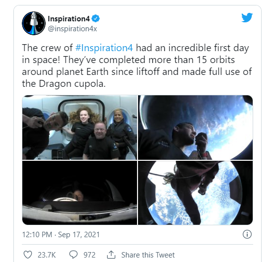 據(jù)外媒 CNET 報(bào)道,周三離開地球的 SpaceX Inspiration4 任務(wù)的機(jī)組人員已經(jīng)在太空中度過了一整天,他們睡覺、吃飯,甚至還投注了體育比賽。但是,除了一個(gè)關(guān)于 Crew Dragon 透明穹頂窗的預(yù)告視頻外,我們還沒有看到太多關(guān)于他們臨時(shí)軌道家園的狹窄空間的情況。值得慶幸的是,Inspiration 4 任務(wù)官方 twitter 賬號(hào)已經(jīng)發(fā)布機(jī)組人員在軌道上第一天的圖像,讓我們看到了他們?cè)?Crew Dragon 中的生活。