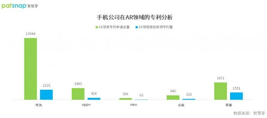 根據(jù)智慧芽全球?qū)@麛?shù)據(jù)庫顯示,截至9月16日,華為、OPPO、vivo、小米、蘋果五家手機公司及其關(guān)聯(lián)公司均已在AR領(lǐng)域進(jìn)行專利布局。具體來看,這些公司分別已公開的AR領(lǐng)域?qū)@暾埩糠謩e為13044件、2483件、366件、940件、3671件,其中授權(quán)發(fā)明專利占比分別約為16.3%、17.1%、17.2%、21.8%、42.3%。