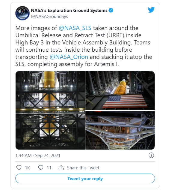 新的圖像來自于 NASA 在寬敞的裝配大樓內(nèi)進(jìn)行的臍帶塔脫離和縮回測試 (URRT) 測試。
