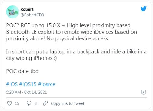早前,一位安全研究人員發(fā)現(xiàn)并報(bào)告了一個(gè)遠(yuǎn)程代碼執(zhí)行漏洞,或允許攻擊者擦除所有 iOS 設(shè)備的漏洞。@RobertCFO 周三發(fā)推稱,其能夠利用這個(gè)可在近距離發(fā)起攻擊的低功耗藍(lán)牙漏洞,在無(wú)需訪問(wèn)的情況下擦除受影響 iPhone 和 iPad 設(shè)備,且后續(xù)還會(huì)提供概念驗(yàn)證演示。