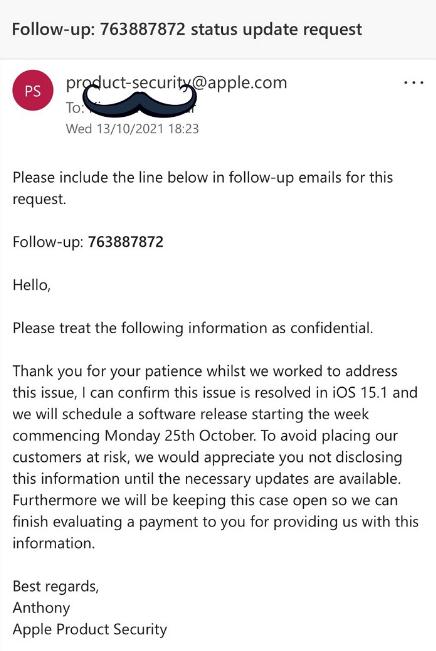 蘋果方面爽快承認(rèn)了這個(gè)問(wèn)題,并表示會(huì)在 iOS 15.1 中得到修復(fù)。同時(shí)要求 @RobertCFO 對(duì)郵件和漏洞利用細(xì)節(jié)保密,直到補(bǔ)丁正式推出。