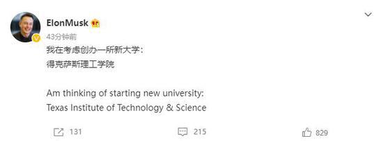 10 月 29 日下午消息,特斯拉 CEO 埃隆·馬斯克微博發(fā)文表示在考慮創(chuàng)辦一所新大學(xué),名為得克薩斯理工學(xué)院(Texas Institute of Technology & Science)。