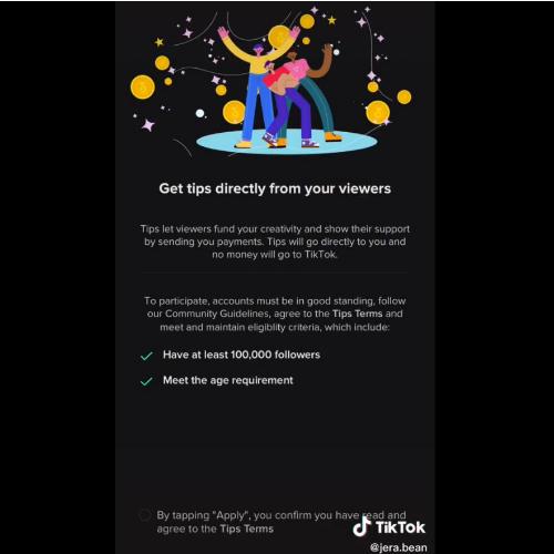根據周四晚上分享的同一創(chuàng)作者的后續(xù)視頻,申請過程似乎進展相當快。Jera Bean 的賬戶現在顯示一個“小費”按鈕,它將用戶引向一個頁面,在那里,用戶可以向創(chuàng)作者提供 5 美元、10 美元、15 美元或自己選擇的自定義金額(最低 1 美元)的小費。此外,該平臺允許以匿名的方式發(fā)送小費。