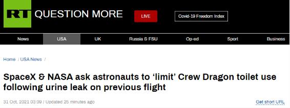 據(jù)美聯(lián)社本月 26 日?qǐng)?bào)道,該媒體援引美國(guó)太空探索技術(shù)公司(SpaceX)副總裁威廉·格斯登美爾的話稱,“龍”飛船上月載 4 名游客展開首次“全平民”太空旅行期間,艙內(nèi)一根管道沒有黏合好,導(dǎo)致尿液灑到風(fēng)扇和地板下。