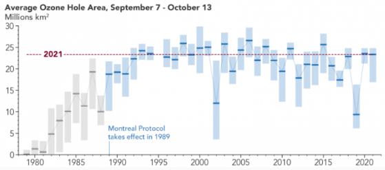 NASA 戈達(dá)德太空飛行中心地球科學(xué)首席科學(xué)家 Paul Newman 說:“這是一個大的臭氧洞,因?yàn)?2021 年的平流層條件比平均水平更冷,如果沒有《蒙特利爾議定書》,它將會更大。”
