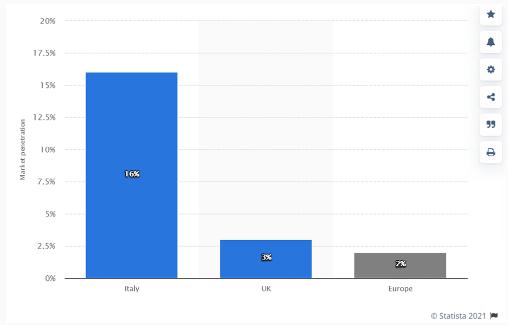 如果說中國沒有 UBI 車險(xiǎn)是因?yàn)楸O(jiān)管機(jī)構(gòu)的高瞻遠(yuǎn)矚的話,那么再將視角拉回走自由市場經(jīng)濟(jì)的歐美,UBI 車險(xiǎn)最好的成果也只有意大利的 16%。