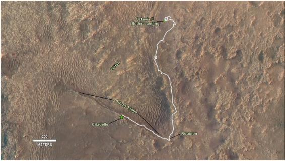 當(dāng)毅力號(hào)在 Citadelle 進(jìn)行采樣活動(dòng)時(shí),Ingenuity 在離地表約 10 米的高度對(duì)漫游車的下一個(gè)潛在采樣地點(diǎn)進(jìn)行飛行勘測(cè)。利用第 12 次飛行中 Ingenuity 返回地球"RTE"相機(jī)圖像,操作團(tuán)隊(duì)能夠確認(rèn)進(jìn)入該地區(qū)路線的可穿行性。2021 年 9 月 12 日(第 200 個(gè)太陽(yáng)日),毅力號(hào)在一天中行駛了 175.15 米,在行駛時(shí)間允許范圍內(nèi),在 8 米長(zhǎng)的路段建立初始地形圖后,其余 167 米的行駛使用了自動(dòng)導(dǎo)航系統(tǒng),這是毅力號(hào)在單日內(nèi)自主行駛的最遠(yuǎn)距離。