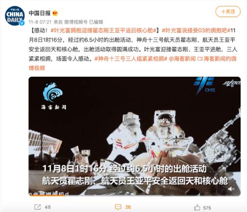 據(jù)中國(guó)載人航天工程辦公室消息,北京時(shí)間 2021 年 11 月 8 日 1 時(shí) 16 分,經(jīng)過(guò)約 6.5 小時(shí)的出艙活動(dòng),神舟十三號(hào)航天員乘組密切協(xié)同,圓滿(mǎn)完成出艙活動(dòng)全部既定任務(wù),航天員翟志剛、航天員王亞平安全返回天和核心艙,出艙活動(dòng)取得圓滿(mǎn)成功。