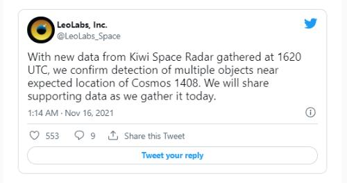 私營太空追蹤公司 LeoLabs 在 Twitter 上證實(shí),它已經(jīng)觀察到多個(gè)物體現(xiàn)在正處于一顆名為宇宙 1408 號(hào)的俄羅斯老衛(wèi)星的位置,據(jù)傳這顆衛(wèi)星是反衛(wèi)星試驗(yàn)的目標(biāo)。據(jù)太空追蹤專家喬納森-麥克道爾說,如果是這樣的話,似乎很可能這次測試產(chǎn)生的碎片云就是周一早上威脅到國際空間站的那個(gè)。